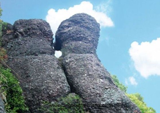 在羅漫山大石牌北端有一尊直徑約一丈,高約五丈的大石柱,它凸出石崖之外,下部同石崖連在一起,上部有分有合。從南邊看猶如一對年輕的情侶在接吻,從北邊看猶如兩位老人在接吻,所以人們稱之為接吻石,人們認(rèn)為是神仙下凡變成的, 版權(quán)所有山東聊城聊之旅國際旅行社有限公司,轉(zhuǎn)載必究!是世界上獨(dú)一無二的奇特景觀,它同中國古代有關(guān) “伏曦兄妹造人民”的神話故事有關(guān),所以人們稱之為天下第一吻或仙人接吻。人們說接吻石是忠貞不渝的愛情楷模,它在演繹著千百萬年流傳下來的愛情故事,人們看到它都會有所感觸,特別是熱戀中的情侶必會熱血沸騰、情感升華……讓天下有情人為之動容!