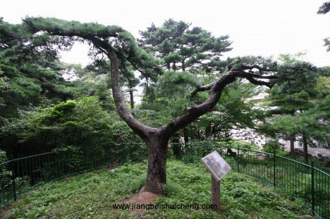 麒麟松位于獅子峰腰,近獅子林精舍。其胸徑50厘米,在樹高l.5米處分作兩干,分別朝東西方向斜展生長,高低錯落。高枝如麟角,低枝似麟尾,主干樹皮如麟甲斑斑,酷似麒麟之態(tài)。故名。今人有詩贊曰:“昂頭翹尾何其神,形同異獸號麒麟。國家昌盛呈祥瑞,預兆山河萬代春。”