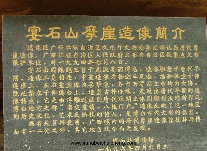 宴石寺正門上書有“宴石寺”三字。它的門聯(lián)和重門聯(lián)為:“宴會(huì)群仙地,石開一洞開”、“宴石鐘靈千古秀,仙橋毓秀萬年居”聯(lián)首分別嵌上“宴石”和“宴石仙橋”顯然把宴石寺、宴石山、宴石仙橋三景融為一體。宴石山壁立如削,寺頂平坦,密草叢叢,荊蘿盤生,輕紗般的霧靄在林間回蕩飄逸。版權(quán)所有山東聊城聊之旅國(guó)際旅行社有限公司,轉(zhuǎn)載必究!往昔,山頂正中有一泓清泉,波光如鏡,池中五彩斑斕的菩薩魚與藍(lán)天白云相映,恍如神魚遨游蒼穹;山頂清泉從峭壁上飛瀉而下,擊中陡崖的凸處,濺起霧珠,被陽光染成七色彩珠,仿佛為宴石寺石山披上一輪佛光,讓人更添神往。站在宴石山頂向東望去約10公里有雞婆石,它象一個(gè)正孵蛋的母雞蹲在雞窩中,在它的背脊上有一個(gè)歪著腦袋窺天的“雛雞”,筆者曾爬上過此山,僅用一個(gè)手指就算有百十人共同出力,也休想挪開它半寸。向南看,蜿蜒的南流江下游約3公里,在兩處山峽間有一個(gè)大平湖,這就是東漢伏波將軍馬援當(dāng)年為平交趾叛亂,動(dòng)用十萬兵士疏鑿出來的馬門灘。向西看去,巍峨雄偉的云飛樟矗立天極,它的身后就是峰巒疊嶂的六萬大山。向北觀看,遠(yuǎn)處是煙靄籠罩的博白城;中間有一座昂天嘯吼的獅子石山,它口中冉冉騰起熱浪直沖云霄;近處又是丹霞地貌最典型的紫陽冠了,它像一定圓形的禮帽,扣在地表上。在宴石山頂,山風(fēng)習(xí)習(xí),颯氣沐身,環(huán)顧四周,頓覺宴石山成了宇宙的中心,整個(gè)乾坤都渺小了。再有江東岸寺西石壁上鐫有神像三尊。摩崖造像雕鑿在離河面約15米的紅砂巖石崖壁上,高三米。中龕坐佛一尊,左右龕為一佛二菩薩。佛像頭部長(zhǎng)方形,兩耳垂肩,身披袈裟,袒右肩,結(jié)跏跌坐于束腰式須彌高蓮座上。左右兩龕佛座各辟一小龕,內(nèi)雕獸頭。造像無題記,從雕刻風(fēng)格及其造型、面像、服飾分析,應(yīng)是隋唐或水稍前刻成,自治區(qū)旅游局認(rèn)定是“廣西第一摩崖”,是目前廣西境內(nèi)已知年代最早的摩崖造像之一。摩崖造像地處漢、唐中原交趾(今越南)交通要道南流江畔,為研究我國(guó)佛教的發(fā)展和南傳提供了可貴的資料。清道光十二年縣志載,摩崖旁“有臨江巨佛一座,高五十余丈,未窮何年所鑿”。遺憾的是,此巨佛在清末或民國(guó)初已倒塌跌落江中,現(xiàn)僅留佛座底裙,尚依稀可辨。
