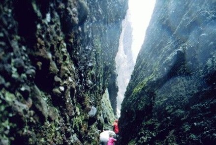 一閘險(xiǎn)一閘,閘閘景不同。水井入谷口處,為“一道閘”。南北山崖壁立,谷底難容一足,眼前是一層樓高的“天梯”通道。出了“一道閘”,抬頭仰望南面半山崖有一處月牙形的龐然大洞;拾級(jí)而上,一個(gè)能容千人的石洞,常年干爽明亮、冬暖夏涼,這里被人們稱為“石窟王宮”。進(jìn)入“二道閘”,它比起“一道閘”更加窄長、更加險(xiǎn)峻。剛才是陽光明媚,轉(zhuǎn)眼間便是天昏地暗。抬頭便可望見兩崖?lián)翁欤闶侵摹耙痪€天”景觀。天設(shè)地造,極其美妙。在閘內(nèi)可以看見南面懸崖上飛濺出一道高約50米、寬5米的“水簾”,似乎向攀巖者彈奏出歡快的迎賓曲。“三道閘”上下約有三層樓高,人們無處落腳,比黃山的“鯽魚背”更險(xiǎn)一籌。身后是萬丈深淵,腳下峭壁陰森,穿過小水潭,隱約能看到懸崖峭壁之間有一條縫隙,其名“地縫”,循著人工開鑿的石凹,手腳并用往上攀爬,進(jìn)入谷內(nèi),有一種豁然開朗的感覺,攀上谷口時(shí),不妨回頭細(xì)看兩石壁上閘痕清晰可辨,谷內(nèi)就是古時(shí)的避王巖。