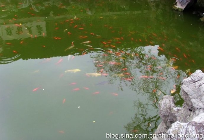水中綠色倒映,五顏六色的魚自由自在地游來游去,顯得真是活潑可愛啊