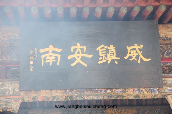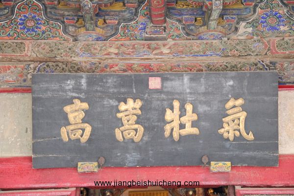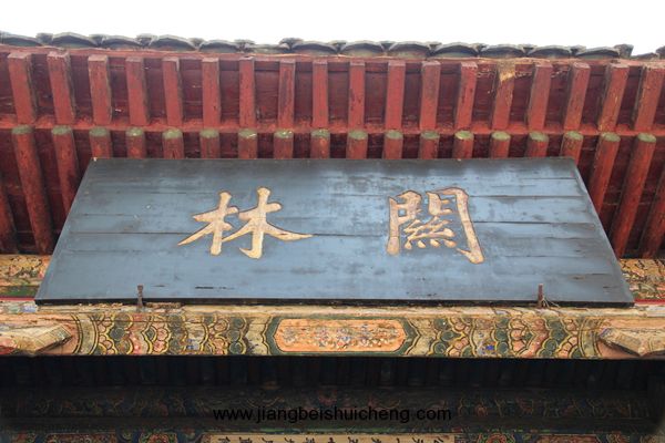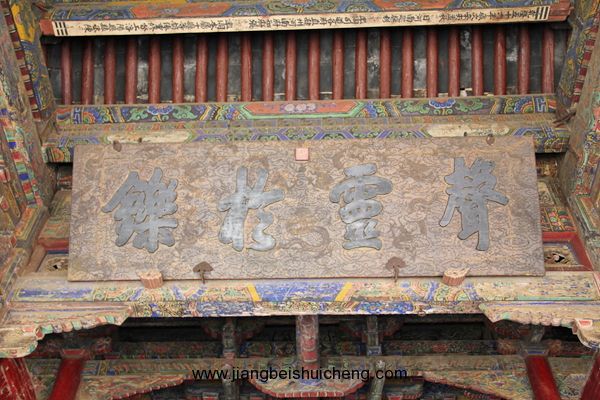 仰面觀之,有一塊大匾高高懸在大門(mén)上,上書(shū)“聲靈于鑠”四個(gè)大字,寓意關(guān)公美好的聲名象美好的音樂(lè)一樣傳揚(yáng)四方。這塊匾是清乾隆十五年乾隆帝所題,同時(shí)兩側(cè)并題有聯(lián)曰:“翊漢表神功龍門(mén)并峻,扶綱伸浩氣伊水同流。”由此可以看出,不僅百姓敬仰關(guān)公,古代帝王對(duì)關(guān)公也同樣尊崇。