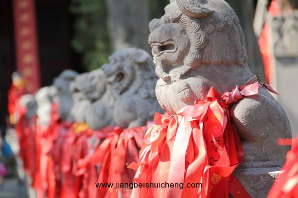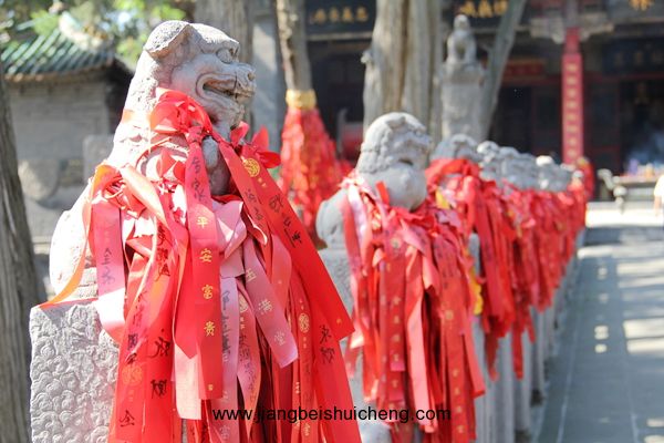 穿過(guò)儀門(mén),你將看到一條我國(guó)關(guān)廟中惟一的石獅甬道。在長(zhǎng)約35米的古甬道上,共有大小石獅104尊安坐兩側(cè)甬柱頂上,大獅姿態(tài)安詳,小獅活潑可愛(ài),百獅百態(tài),讓人稱奇。