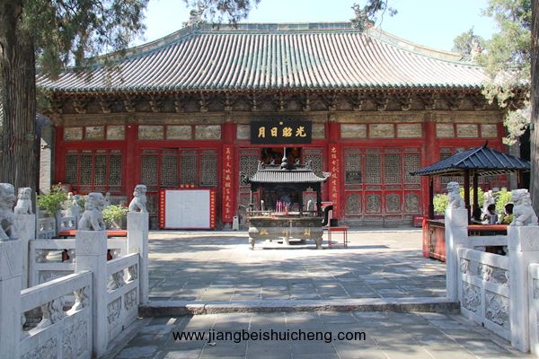 關(guān)林大殿,始建于明萬(wàn)歷二十四年(1596年),面闊七間,進(jìn)深三間,高26米。廡殿頂,琉璃瓦覆蓋,五脊橫立,六獸揚(yáng)威。正門(mén)上,有12幅明代浮雕木刻。說(shuō)的是桃園三結(jié)義,三英戰(zhàn)呂布等故事。