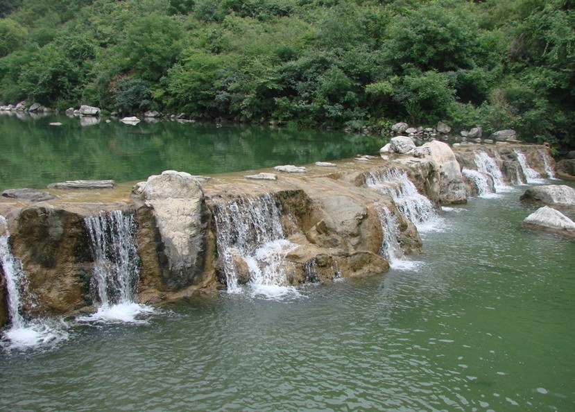 三、潭瀑峽地處云臺山北部略偏西,是主要河流子房河的一個源頭。溝長2000米,南北走向。溝東面,峭壁聳翠,基巖裸體。溝西面,競秀峰參差俏麗,峰群一字排列,峰峰直立,爭奇斗異。在曲曲彎彎的溝槽內(nèi),瀠洄著一條會唱歌、會跳舞的溪水。這條能歌善舞的溪水叫小龍溪。它的溪床,由一層層高低不一、色彩有別、寬窄不同、曲折有致、形態(tài)各異的自然山石臺階所組成。小龍溪則像一隊美麗的歌舞明星,以層層臺階作舞臺載歌載舞,翩翩歷階而下。并在每個石階舞臺上,表演出精彩的節(jié)目,奉獻(xiàn)出妙不可言的美景。或碧波蕩漾,或為溪布,或分水涓涓細(xì)流,或匯合湍湍激流,或傾瀉、或跌落成為銀光閃閃的瀑布,瀑下積水,成為彩潭。色澤悅目,清音悅耳。承蒙大自然造化的神奇,逆水而行,有如游仙,步步引人入勝,美景層出不窮,好戲連臺,演奏出十二部美好的山水樂章。即:迎賓第一潭、九對情人、翡翠仙子、金潭銀瀑、丫字瀑潭、群芳競秀、隋唐山寨、清漪仙池、水簾仙居、碧玉仙子、仙蹤劍影、龍鳳呈祥。