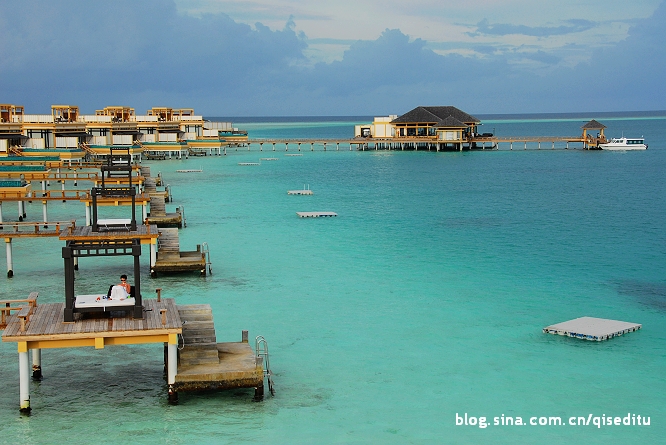 這就是維拉瓦魯?shù)乃衔萘耍ㄟ^一條木板走廊鏈接在一起,遠處綠色的那一片,就是主島,俗稱海龜島