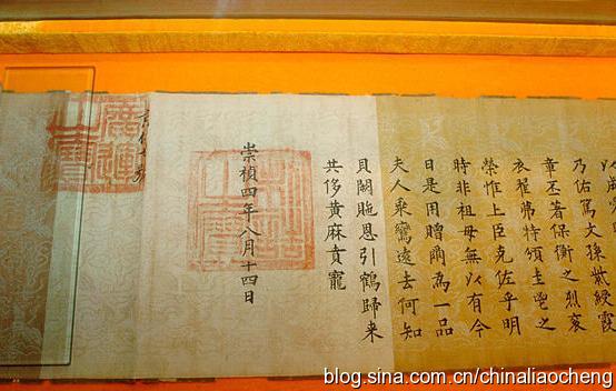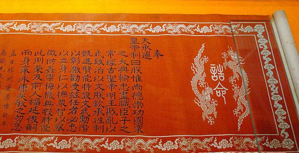 博物館館長(zhǎng)劉新華先生介紹,這處“圣旨”博物館為二層仿古建筑,展出面積1000多平方米,館藏明代、清代的詔書(shū)、國(guó)書(shū)、誥封、敕封(通稱(chēng)為圣旨) 達(dá)132道之多,開(kāi)館展出的“圣旨”55道,以及“偽滿(mǎn)洲國(guó)圣旨”和日本、越南、韓國(guó)等國(guó)家的“圣旨”,并配以明清時(shí)期的科舉試題、殿試卷、官場(chǎng)文書(shū)、字畫(huà)匾牌及用墨魚(yú)汁做墨汁密寫(xiě)在衣衫內(nèi)的“夾帶小抄”等科舉文物2000多件,反映了當(dāng)時(shí)的政治、經(jīng)濟(jì)、軍事、外交及中國(guó)宮廷文化等多種形態(tài)。
