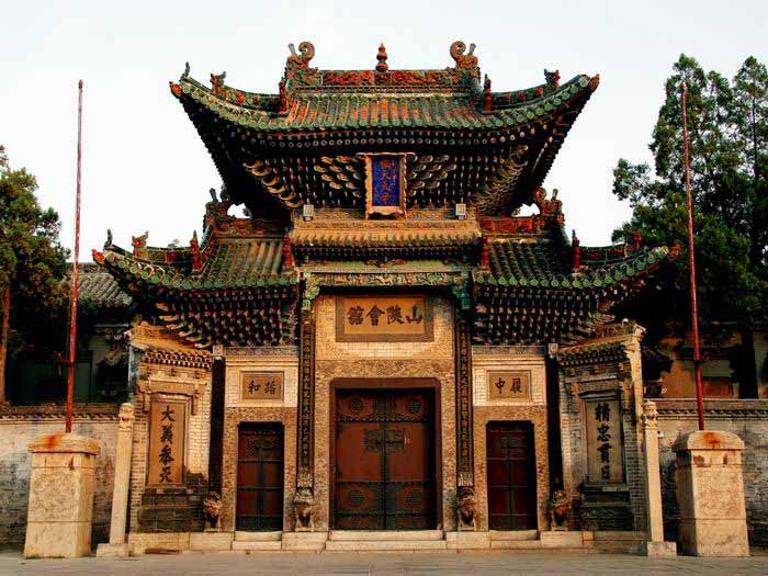 山門,是會館的大門,三間牌坊式門的樓,上方懸掛的豎匾“協天大帝”,是說關公是協助上天統御萬眾的神。下方的木質浮雕垂花門罩,雕刻著白象、駱駝、棋鱗等佛教吉獸和托塔天王李靖等佛教天王。大門高3米,寬2、3米,兩側的對聯是歌頌關公的,“本是豪杰作為,只此心無愧圣賢,詢足配東國夫子;何必仙佛功德,唯其氣充塞天地,早已成西方至人。”意思是說:“關公的所作所為己經是一位豪杰了,而他的思想和品德就算和圣賢相比,也是無愧的,足以和東方魯國的孔夫子相媲美;您何必修仙拜佛呢,關公并沒有那樣做,但他的浩然正氣卻能夠充塞于天地之間,早已成為最完美的人了”。對聯將關羽的地位放在最高頂點,以和孔子相匹配,體現出濃郁的地方特色。兩邊的小門上方各有石刻匾額一方,體現出儒家思想的中庸之道;“履中”是說做人應該行為中正;“蹈和”是講待人接物應該和氣,在這里也可以表現出商人講究和氣生財的處世哲學。小門兩邊是磚砌八字影壁,刻有“精忠貫日,大義參天”,是對關公一生的高度評價,由此也可以表明會館是一座關帝廟的宗旨。