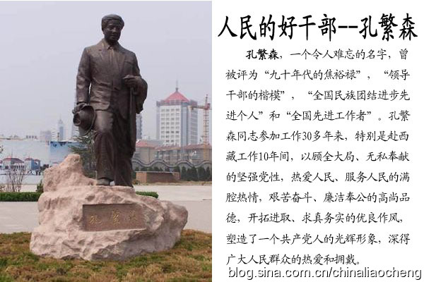 孔繁森同志參加工作30多年來,特別是赴西藏工作10年間,以顧全大局、無私奉獻的堅強黨性,熱愛人民、服務人民的滿腔熱情,艱苦奮斗、廉潔奉公的高尚品德,開拓進取、求真務實的優良作風,塑造了一個共產黨人的光輝形象,深得廣大人民群眾的熱愛和擁戴。然而,天有不測風云,人有旦夕禍福,1994年11月29日,孔繁森同志在赴新疆塔城地區考察途中,被一場車禍無情地奪去了寶貴的生命。孔繁森用鮮血和生命譜寫了一曲富有時代精神的奮斗之歌、創業之歌、奉獻之歌。他的英雄事跡和崇高精神令人震撼、催人淚下、激人奮進。中央電視臺、中央人民廣播電臺、《人民日報》、《求是》雜志等數十家新聞媒體對孔繁森同志的事跡給予了特別報道。為了緬懷英靈,激勵后人,聊城人民在他的故鄉山東聊城興建了孔繁森同志紀念館。原中共中央總書記、國家主席、中央軍委主席江澤民,原國務院總理李鵬,原全國人大委員長喬石,原全國政協主席李瑞環分別為紀念館題詞。中共中央總書記、國家主席、中央軍委主席胡錦濤同志發表署名文章《全黨都來學習孔繁森》。