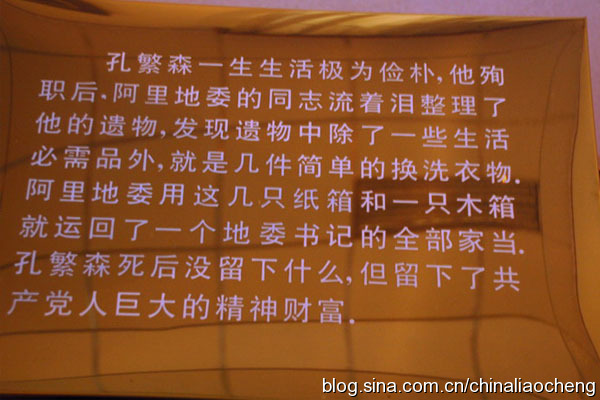孔繁森遇難后,阿里地委在清理他的遺物時。發現除了一個袖珍收音機之外,就是這幾件簡單的換洗衣物,還有僅剩下的8塊6毛錢。這里擺放的,是我們根據孔繁森在阿里的生活住所,制作的一個模擬區。當時,孔繁森按照藏族同胞的生活習慣,簡單地布置了自己的住所,就是在這所房子里,孔繁森和收養的兩個孤兒共同度過了1年多的時間。