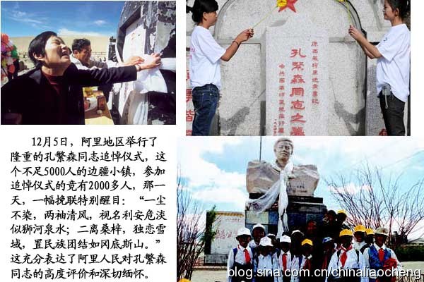 12月15日,阿里地區舉行了隆重的孔繁森同志追悼儀式,這個不足5000人的邊疆小鎮,參加追悼儀式的竟有2000多人,那一天,一幅挽聯特別醒目:“一塵不染,兩袖清風,視名利安危淡似獅河泉水;二離桑梓,獨戀雪域,置民族團結如岡底斯山。”這充分表達了阿里人民對孔繁森同志的高度評價和深切緬懷。