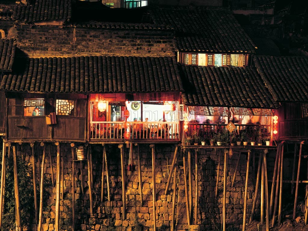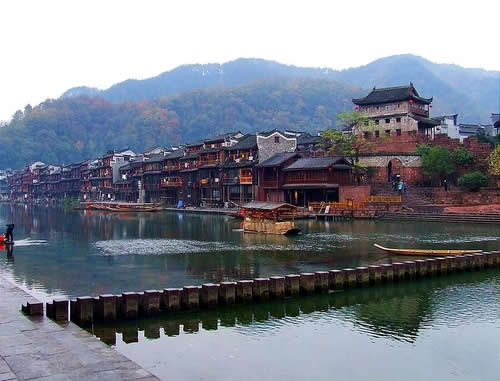 鳳凰古城始建于清康熙四十三年〔1704年〕,歷經300多年的風雨滄桑,古貌猶存。現東門和北門古城樓尚在。城內青石板街道,江邊木結構吊腳樓,以及朝陽宮、古城博物館、楊家祠堂、沈從文故居、熊希齡故居、天王廟、大成殿、萬壽宮等建筑,無不具古城特色。古城以古街為中軸,連接無數小巷,溝通全城。古街是一條縱向隨勢成線、橫向交錯鋪砌的青石板路,自古以來便是熱鬧的集市,如今更加生機勃勃。鳳凰古城的標志性建筑之一虹橋,原名臥虹橋,歷史悠久。鳳凰古城北門城樓本名“碧輝門”,采用紅砂條石筑砌,既有軍事防御作用,又有城市防洪功能,是古城一道堅固的屏障。鳳凰古街兩邊建筑飛檐斗拱,店鋪陳設著琳瑯滿目的民族工藝品,濃濃的古意古韻,透出古街深厚的民族文化底蘊。