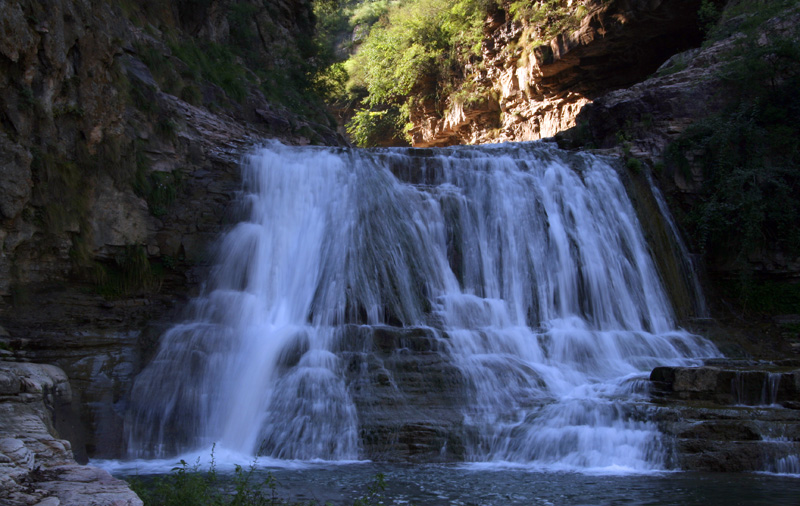 無獨有偶,再行5公里之地,又有一個天生的洗臉盆,面積三分地大,形似滴水盆,圓如規定徑。水無源,清波蕩漾;盆無蓋,一眼見底。當地人將滴水盆與洗臉盆稱為筋骨相連的子母盆。過了洗臉盆便是水簾洞。一股兩米寬的泉水從北峽溝的洞中涌出,緩流四五十米后順山崖直壁而下,一派“飛流直下三千尺”的磅礴氣勢。其后一深洞,嘩嘩瀑布落就半崖伸出的青石板上,打著飛快的漩渦卷人洞內,而后又從洞底端漏口處噴出,驚濤駭浪之聲震山蕩谷。