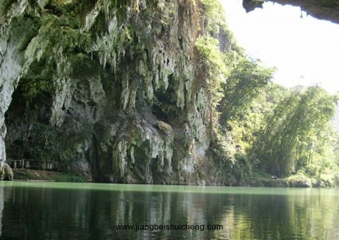 百鳥巖,位于廣西巴馬瑤族自治縣甲篆鄉烈屯西北面的漠齋山下,別名龍虎洞。因洞內燕子棲集,蝙蝠掠飛,又名百鳥洞。盤陽河自吉屯白熊洞潛入山下,形成1000多米的伏流暗河后,在此洞流出。洞口寬50米,一石壁把洞口分成兩個略呈三角形的左右洞口。左側洞口寬40米,高16米,兩洞口內側相通。洞深500米,蜿蜒曲折,直通與白熊洞一山之隔的拉類坳下的一個側洞口。洞中水平如鏡,深不可測,寬處約40米,窄處10米,從洞口行舟至300米轉折處,距水面30米處有一圓形天窗,山坳之光照到水面,猶如舞臺上的光束,色彩紛呈,近右側洞口處有沙灘,版權所有山東聊城聊之旅國際旅行社有限公司,轉載必究!可停靠舟船。沙灘右側是一塊30多平方米的石臺,臺面深溝淺窩,坑坑坎坎,石臺一側,洞壁雪白,可攀援其中。有石鷹、石柱、石幔、石觀音菩薩等,百態千姿,令人目不暇接。石臺的周圍有仙女梳妝、海螺石,石螺對面有石桌、石缸和石松果等。側面洞口外香椿林下野花艷目植被繁衍,把洞口點綴得幽靜雅致。洞中歧洞叉水道不可勝數,密如蜂房,不知所向,整個洞仿佛一座裝飾華麗、景幻莫測的水下龍宮。其奇特的景象似桂林蘆笛巖,又因非乘舟不能游覽,游人贈予“水上蘆笛巖”的美譽。