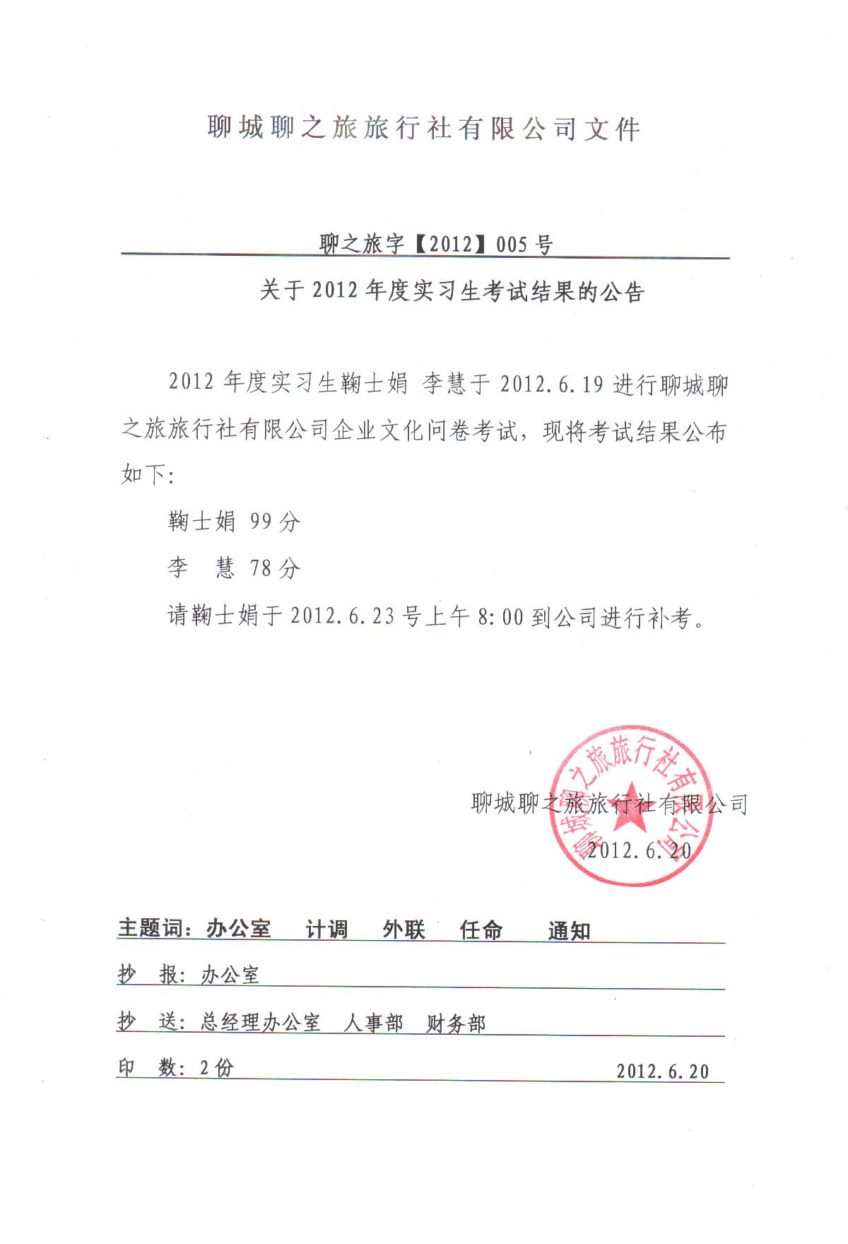 關于2012年度實習生考試結果的公告