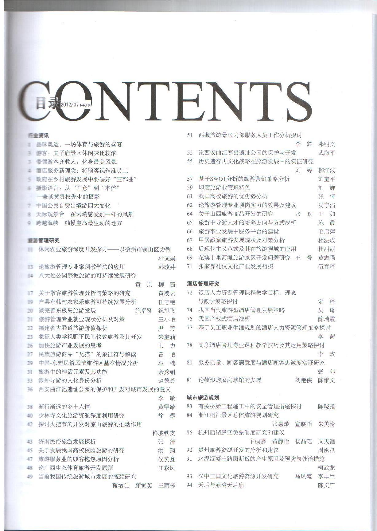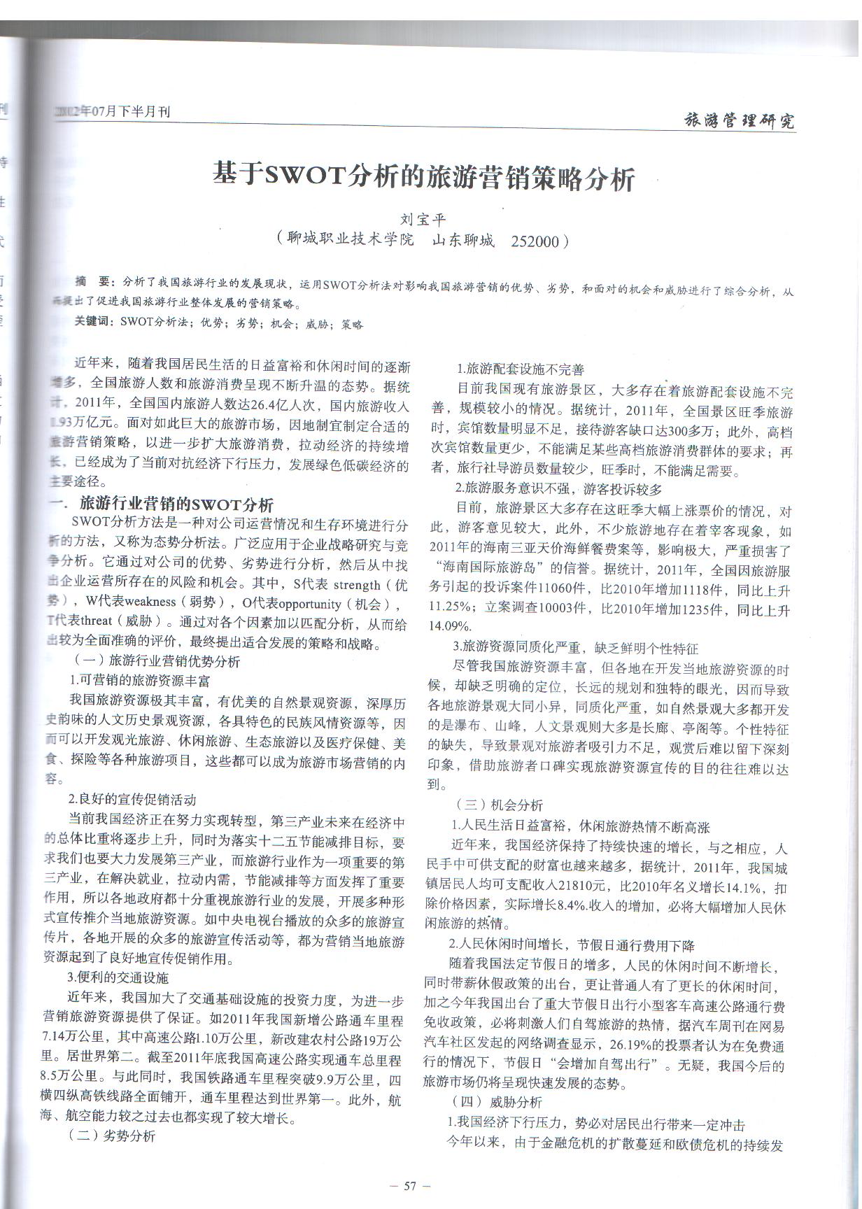 聊之旅旅行社董事長劉寶平發表文章《基于SWOT分析的旅游營銷策略分析》刊登在國際級刊物《旅游縱覽》2012年7月版。