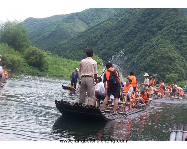 “江南第一漂”位于徽水河流經(jīng)涇縣的最后一段,上起烏溪鄉(xiāng)姚村,下止黃村鄉(xiāng),景區(qū)全長約20公里。景區(qū)內河道蜿蜒曲折,水流湍急,兩岸層巒疊翠風光綺麗,是休閑旅游的好去處。徽水河漂流途經(jīng)五大景區(qū):起筏地叫龍?zhí)叮瑸╅L浪急,游人在竹筏上隨浪俯仰,跌宕穿梭,一種戰(zhàn)勝大自然的酣暢淋漓之感油然而生。接下來是“早霧山”景區(qū)。這里終日云霧繚繞,而水平浪穩(wěn),版權所有,山東聊城聊之旅國際旅行社有限公司,轉載必究!使游人跌宕之心轉而為柔情愜意。早霧山下端河道突轉急彎,形成“刁潭”,岸邊巨石上的“潭古印”,版權所有,山東聊城聊之旅國際旅行有限公司轉載必究!形象地記錄了昔日放筏工艱難的歲月。這里不知有多少放筏工誤落水中,而落水者卻浮而不沉,因而留下了“刁潭不刁”的神奇?zhèn)髡f。而“胡老灣沖浪”則更是一彎三折,灘中有垅、垅中有灘,千余米的河道落花流水差一米多,游人最能體現(xiàn)“兩岸猿聲啼不住,輕舟已過萬重山”的古詩意境。急灘甫過,柳暗花明又一村——溪西山到了,這里山高水秀,常有云霧繚繞,村舍依山俯傍水而筑,是道地的農(nóng)家風光。沿流停筏,小扣柴扉,你能喝到頂級的綠茶“溪西山毛峰”。接下來便到了五雀嶺景區(qū),這里有雞公石、馬影石、木魚墩、百畝草坪、高灘晚釣、斷橋綠水等景點,人稱“江南小漓江”。