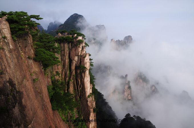 始信峰的特點是巧石爭妍,奇松林立,三面臨空,懸崖千丈,云蒸霞蔚,風姿獨秀。