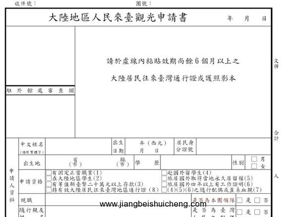 4)填寫完整的《北京市居民往來臺灣地區申請表》(出入境管理處提供)