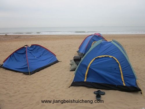 (在海邊用的帳篷):大一些,帶紗網能透氣的。防潮墊、氣墊,單層的薄睡袋就足夠了。