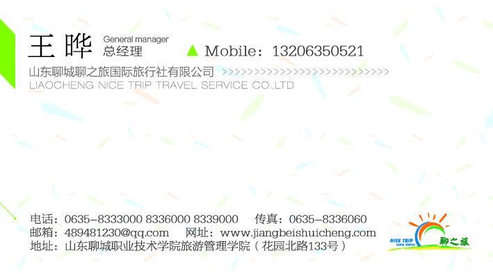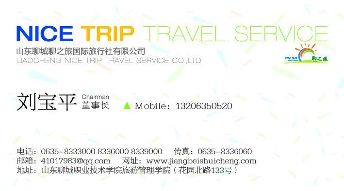 電話:0635-8333000 8336000 8339000 傳真:0635-8336665 地址:山東省聊城市東昌府區興華東路7號 郵編:252000 官方網站:www.qd-kingoal.com.cn 歡迎致電全國統一(免長途)熱線:400 0635 369 國內旅游請按1 國際旅游請按2 聊城旅游請按3 票務會議租車請按4 人工請按0 版權所有:Copyright(C) 劉寶平工作室_Mr.Liu Stu 聊城市旅游攝影協會 「我們」? 商會丨俱樂部丨實業公司 山東聊城聊之旅國際旅行社有限公司
