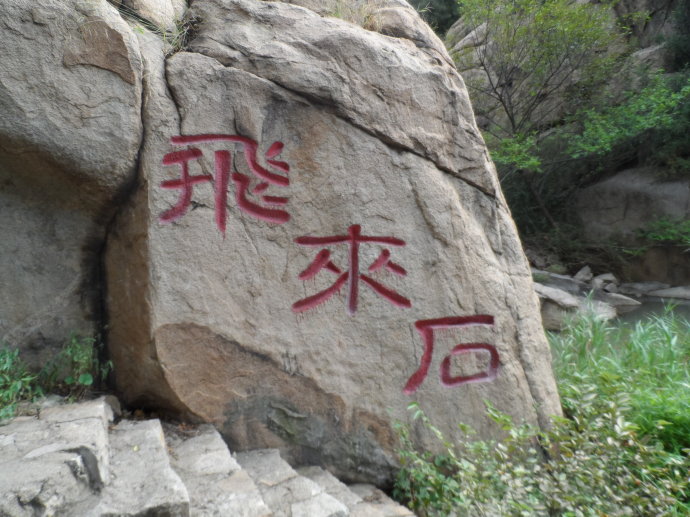 上個世紀 70年夏季的一個中午,一聲響雷過后,左側山崖上方40米處的一塊巨石被震落下來,落于山澗之中,稱為飛來石。