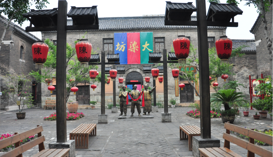 【大染坊】清道光年間東來(lái)升綢布莊的舊址,典型的前店后廠的格局,保存完好的建筑迄今已有近200年的歷史,現(xiàn)保存完好的兩進(jìn)院落展示了清末染坊的繁榮盛景。2002年,熱播的電視劇《大染坊》故事的發(fā)生地就在這里。陳壽亭在周村創(chuàng)業(yè)的場(chǎng)景在這里再現(xiàn)。該劇著名編劇陳杰先生為家鄉(xiāng)再度創(chuàng)作并在此拍攝了電視連續(xù)劇《旱碼頭》。陳杰先生英年早逝,陳杰紀(jì)念館坐落于院內(nèi),在這里可以伴隨先生共同聆聽《大染坊》、《旱碼頭》的故事。