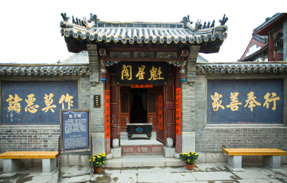【魁星閣廟群】位于銀子市街南首,是周村現(xiàn)存最完整的寺廟古建筑群之一。由三座不同宗教文化的廟宇組成,有道教的碧霞元君殿、佛教的觀音殿、儒教的魁星閣,道儒佛三教共處一地。無(wú)論是來(lái)自五湖四海的商人,還是方圓百里的父老鄉(xiāng)親,無(wú)論是求平安,求富貴,求早得貴子,還是求金榜題名,都可以在這里得到精神寄托。因此,百余年來(lái)香火一直十分旺盛。