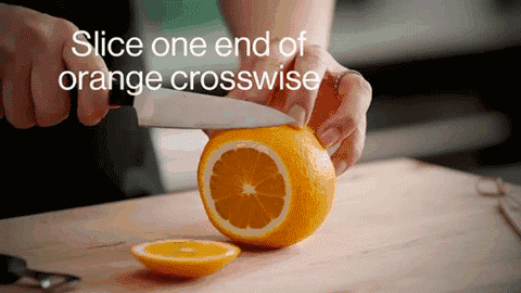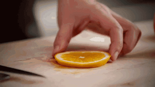 1.先把橙子頂部去掉,然后先切3mm厚度的橙片,切至2/3處收刀,