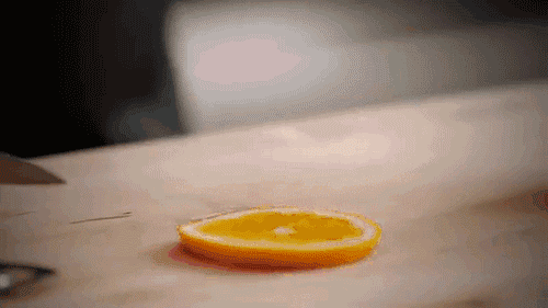 讓橙片連在橙子上,緊接著再切相同厚度的橙片,