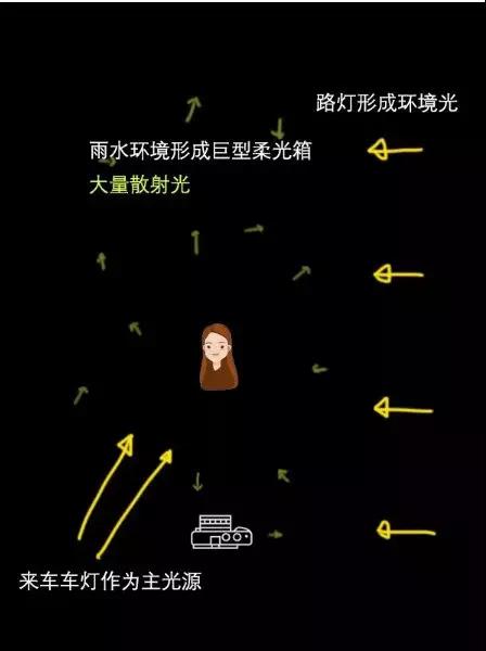 ?下面這一組,同樣是車燈作為主光源,路燈提供環(huán)境光,而雨水則形成天然的柔光箱,使整個(gè)大環(huán)境看成是一個(gè)均勻光。