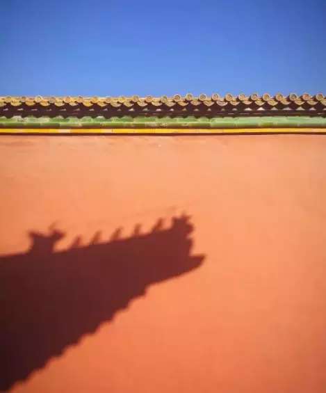 藍(lán)色的天空,紅色的宮墻,屋檐的影子打在宮墻上,加強(qiáng)了色彩的對(duì)比,讓畫面更加簡潔。