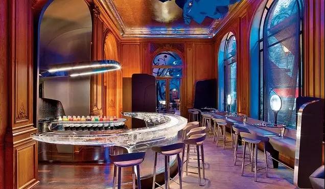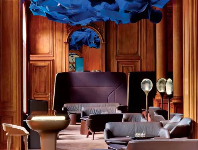 巴黎Plaza Athénée酒店的Le吧的設計,展現了古典建筑與現代藝術的完美融合,天花頂的藍色云朵裝置是最大的亮點,現代的創意家具讓空間品位十足,也體現了巴黎的優雅。