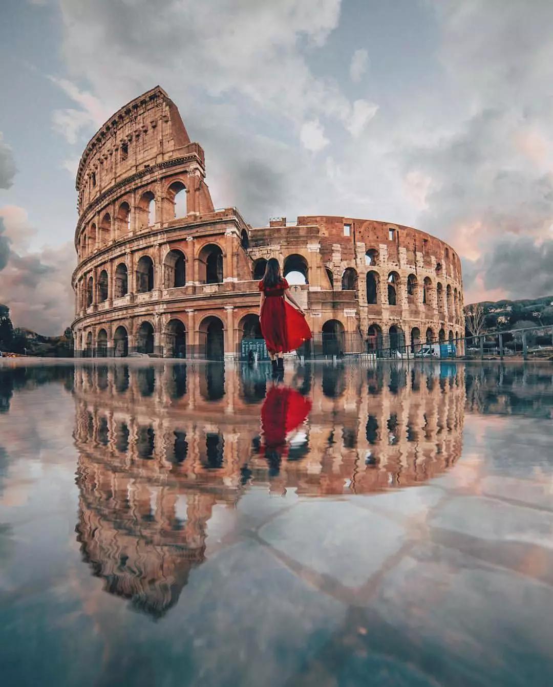 龐大的羅馬斗獸場與穿著一席紅裙的少女相融合,散發(fā)出一種古羅馬的人文氣息,水中的倒影又給畫面增添了一絲絲神秘夢幻感。