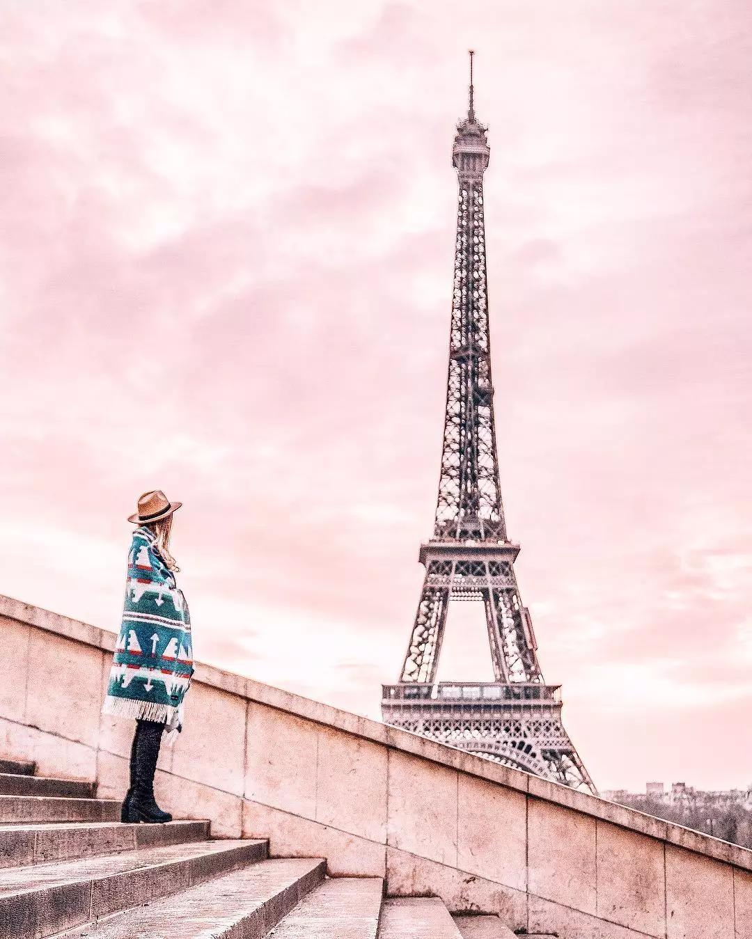 巴黎鐵塔邊的女孩,畫面以粉色調(diào)為主,洋溢著濃濃的浪漫主義風情。