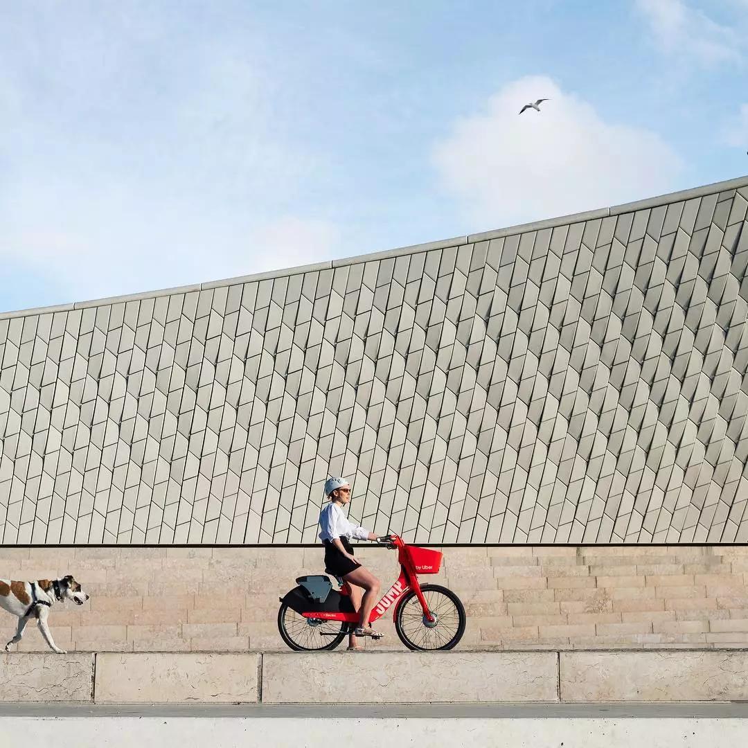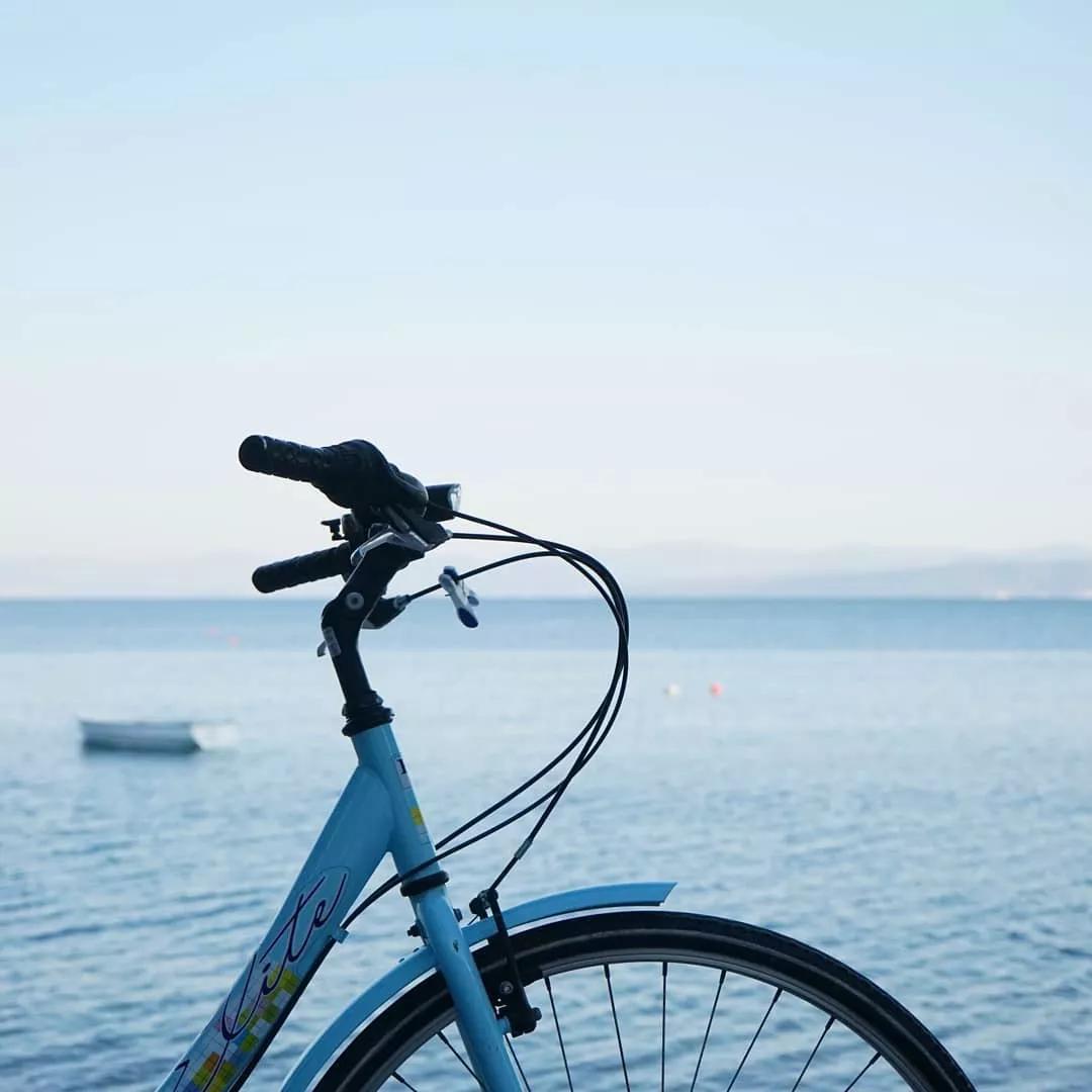 以虛化的大海與藍天為拍攝背景,畫面簡潔而干凈,將自行車的車頭作為近景拍攝的主體部分,藍色外觀與背景顏色相呼應,營造出一種清新靜謐感,同時也突顯出自行車的架構(gòu)。