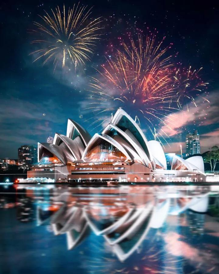 拍攝澳大利亞悉尼歌劇院,采用中景拍攝,將歌劇院特有的帆造型展現(xiàn)在觀者面前,感受建筑設(shè)計的獨特魅力,夜空中綻放的煙花讓畫面更有趣味性,烘托出熱鬧的氛圍。