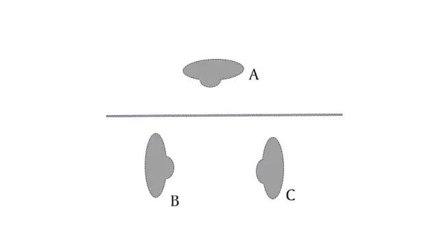 當A站在軸線另外一側,這時候B在左側,C在右側;