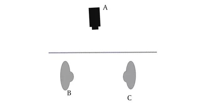 因為他們站在了分割線的同一側。假設:從攝影機的第一個機位來看,A站在左邊,B站在右邊: