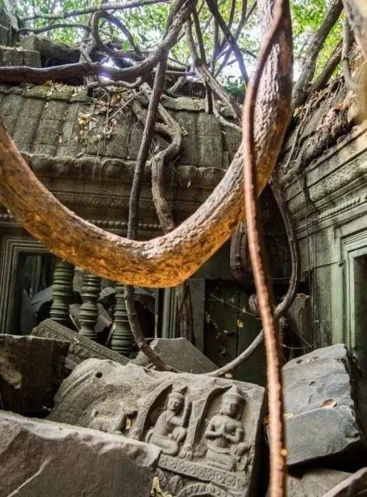 崩密列是吳哥窟公認(rèn)最神秘的寺廟,崩密列的歷史還處于不明狀態(tài),據(jù)學(xué)者推測(cè)大約建造于 11 世紀(jì)末至 12 世紀(jì)初,宮崎駿電影《天空之城》的原型,古寺搭配樹(shù)木、青苔、落葉建構(gòu)出唯美的意象。整個(gè)寺廟嚴(yán)重崩塌,石頭落了一地沒(méi)有任何保護(hù),感覺(jué)人人都可以撿走,被叢林層層覆蓋千年,各種被封死的的門(mén),似乎里面隱藏著大秘密。