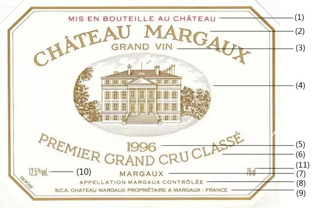 主要包含信息:(1)裝瓶地點 (2)酒莊名稱 (3)優質葡萄酒 (4)酒標圖案 (5)葡萄采摘年份 (6)酒莊等級 (7)子產區名 (8)原產地控制命名 (9)生產商 (10)酒精度 (11)容量