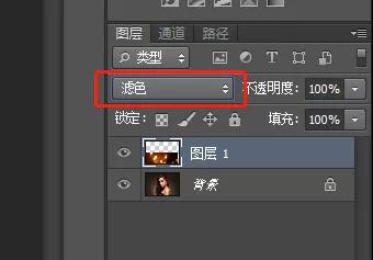 然后選中光斑圖片,將它的類型改變成“濾色”,這時候再來看看效果,很明顯光斑圖片已經變得類似于透明的了。至于這里的不透明度,大家可以不用管它,因為后面可以通過色階來進行改變。