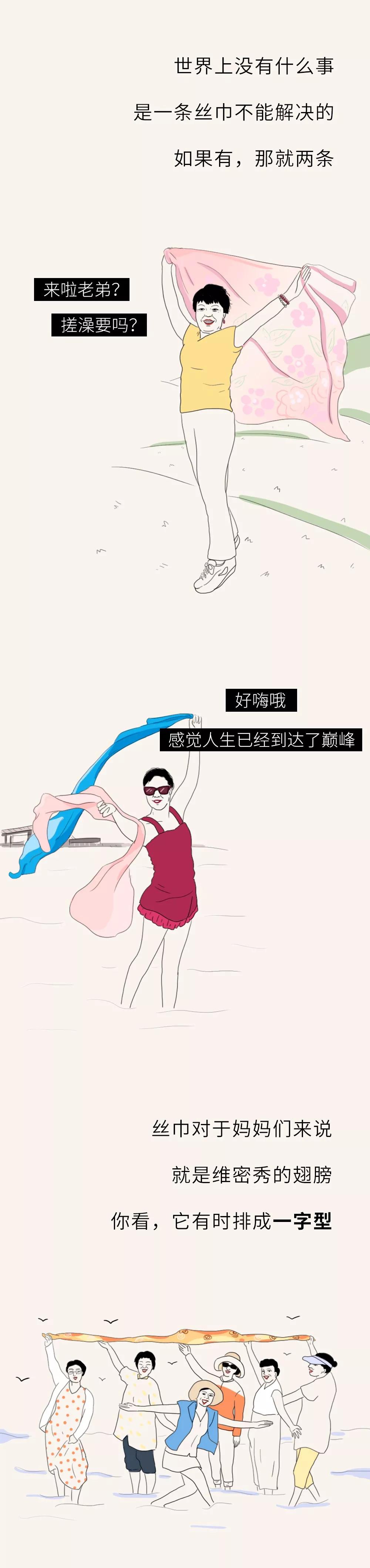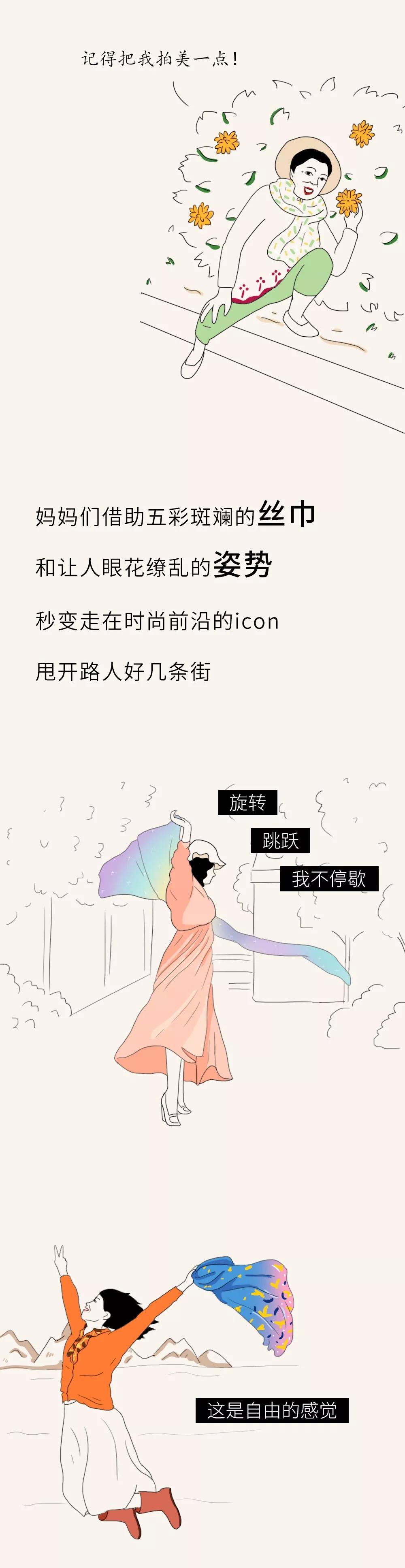 每次一到景區(qū),身披各色絲巾的大媽們,絕對是一道亮麗的風景線:她們紅得像火、粉得像霞、綠得像草、白得像雪、藍得像天,憑自己的實力向你證明:什么才叫五彩斑斕。她們的人生信條就是:頭可斷,血可流,絲巾不能丟。絲巾舉過頭頂?shù)哪且凰查g,感覺自己就是Super star。對于她們來說,萬物皆可盤拍:除了景區(qū)的標志性建筑、各種帶字的標牌、花草樹木,還有石獅子、雕像、欄桿等等,甚至連路邊發(fā)傳單的玩偶也不放過……