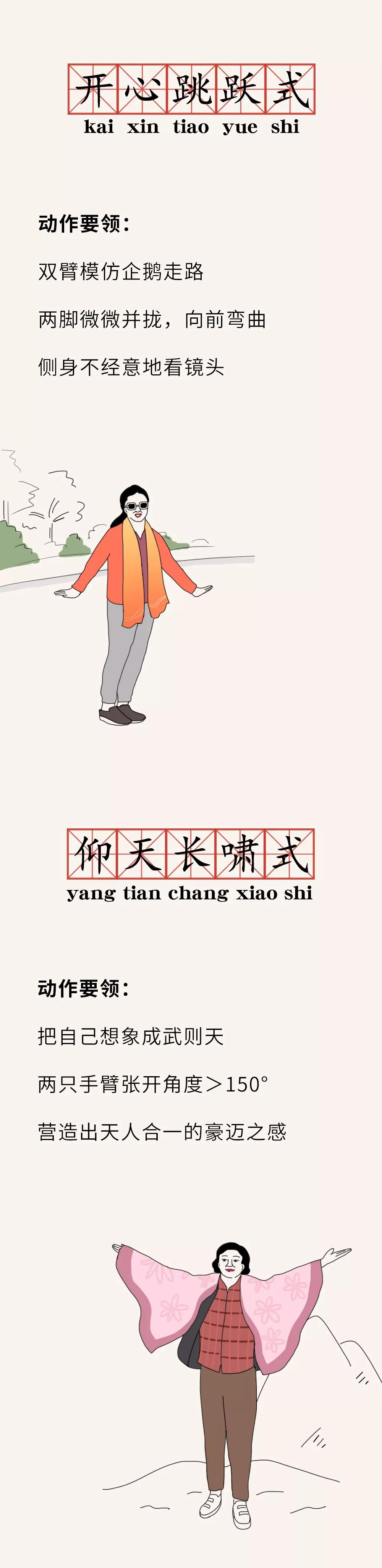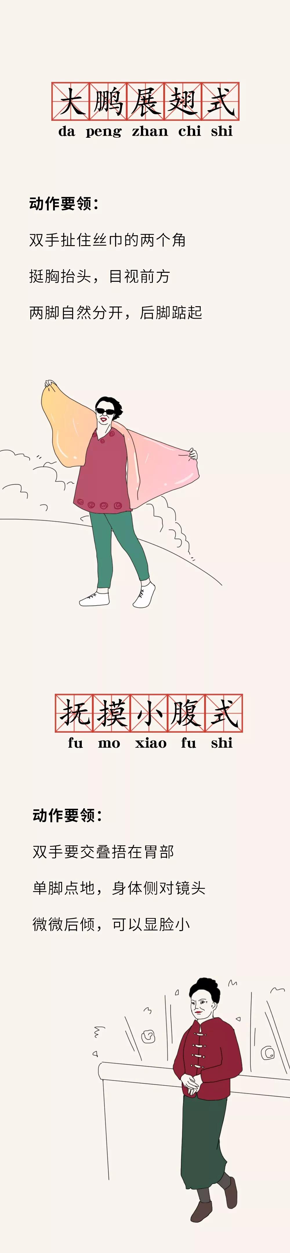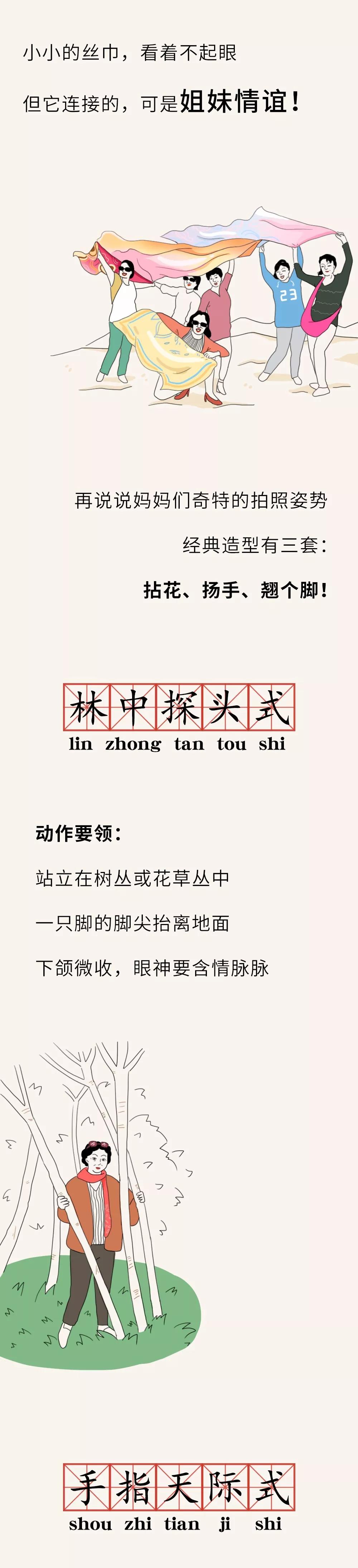 不得不佩服大媽們的新潮,當90后拍照還在嘟嘴比剪刀手的時候,她們已經研究出了各種奇特的拍照姿勢,分分鐘亮瞎你的鈦合金狗眼。廣場舞可以不跳,但拍照絕對不能含糊。拍照道具有三寶:墨鏡、絲巾、太陽帽,經典造型有三套:拈花、揚手、翹個腳。看完她們和小姐妹的朋友圈曬照,你總會忍不住哼起那句:最美不過夕陽紅,溫馨又從容……