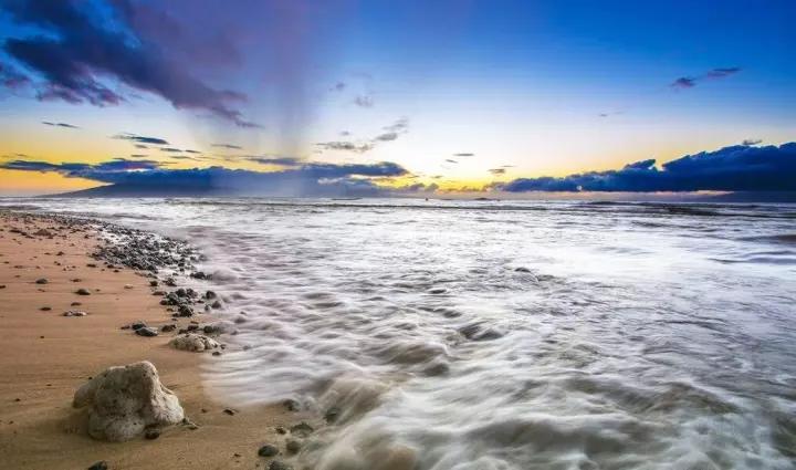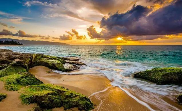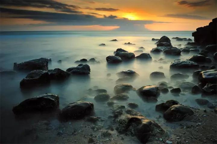 使用慢快門。想要拍出海水運(yùn)動的動感,可以利用慢門進(jìn)行拍攝,運(yùn)動著的海水與靜止的沙灘、石頭形成一個(gè)很好的動靜對比效果。
