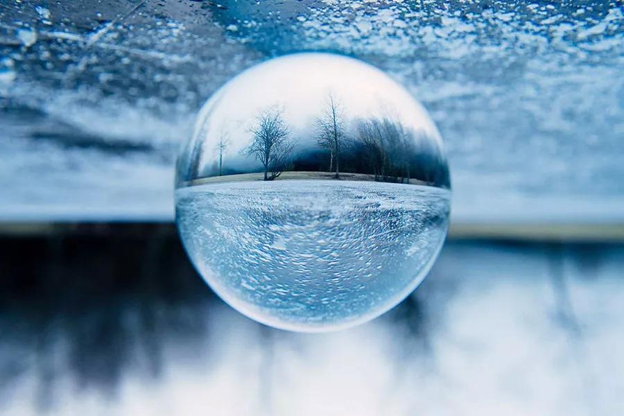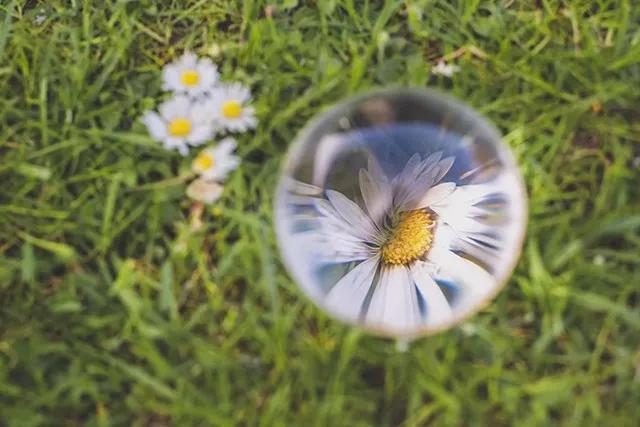 使用水晶球進行聚焦,不僅可以實現放大,還可以利用畸變來使紋理產生一定的變化感;再利用小/清晰虛像與大/模糊實景的對比,會讓作品顯得更有趣。