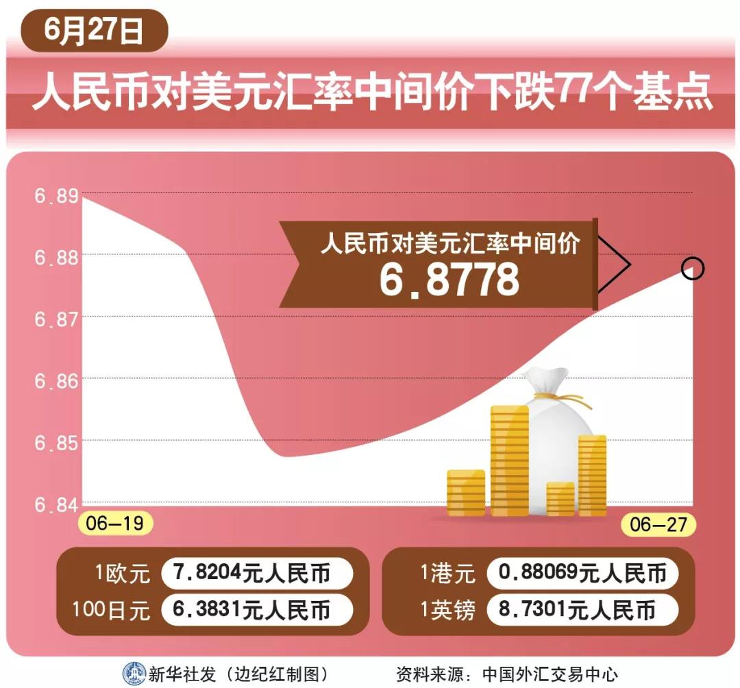 ·27日人民幣對美元匯率中間價報6.8778,較前一交易日下調(diào)77個基點。