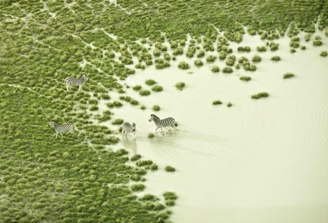 而鹽沼周圍,草木生長,海藻般的青綠色覆蓋了大部分的鹽池區域。成千上萬只粉紅色火烈鳥與斑馬群、公牛群和鬣狗在這里共同生活著。