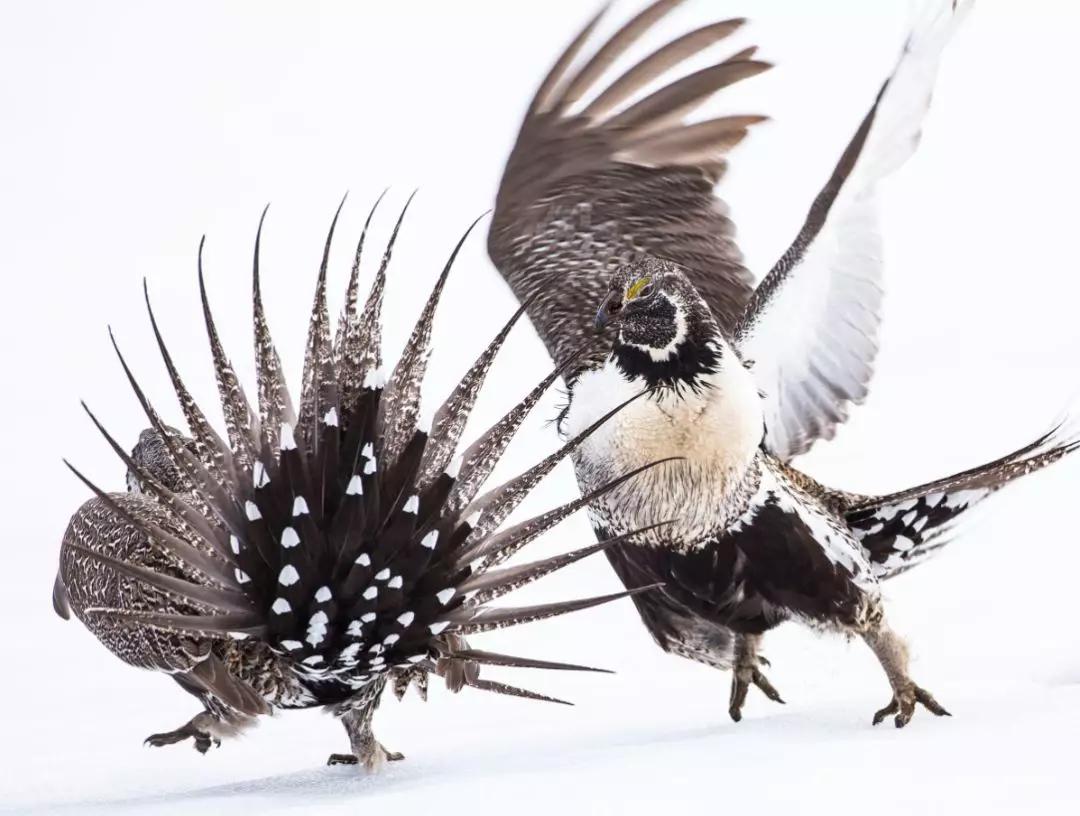照片背后的故事:“我用了很多個春天寒冷的早晨來拍攝大艾草松雞求偶的場景。一開始,照片中的這兩只競爭者肩并肩地坐在一起,突然之間,它們仿佛收到了某種暗號,開始用翅膀向對方發起攻擊。這張在堅硬的積雪地上抓到的照片,展示了大艾草松雞為了求偶打架時的力量。”
