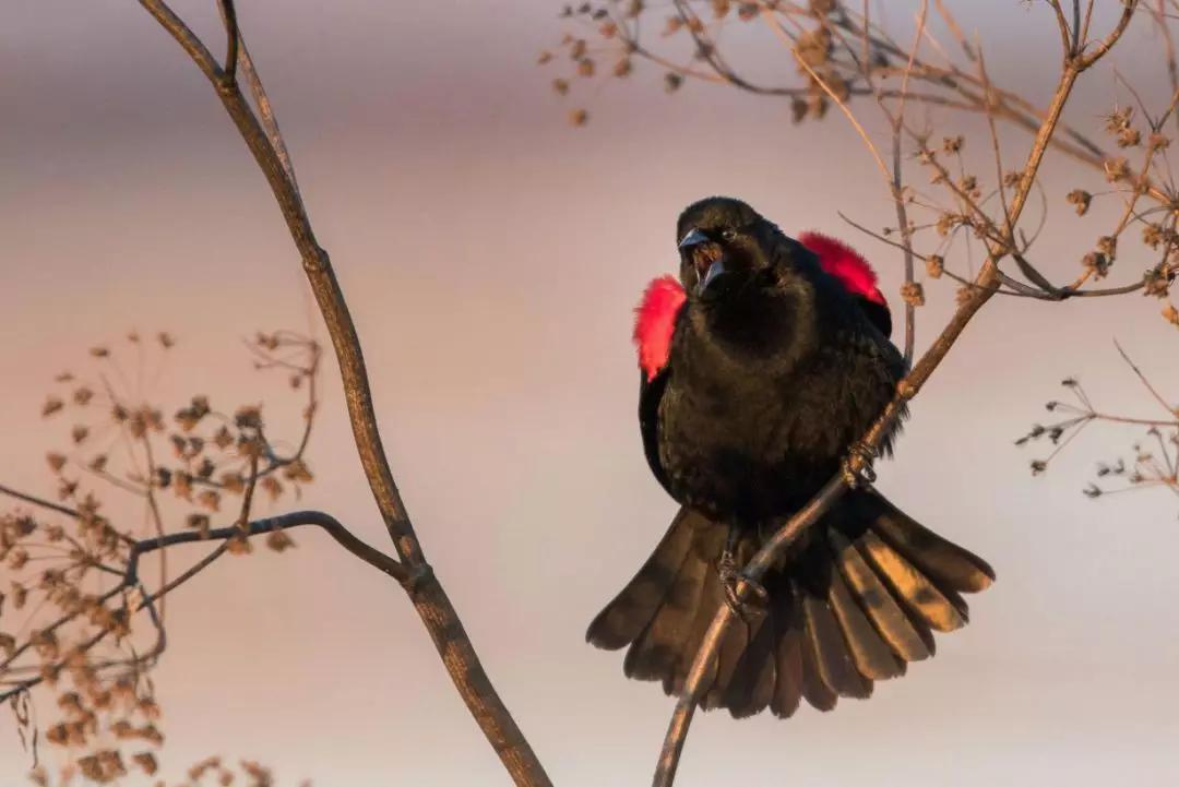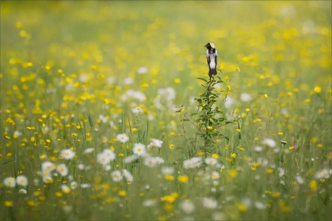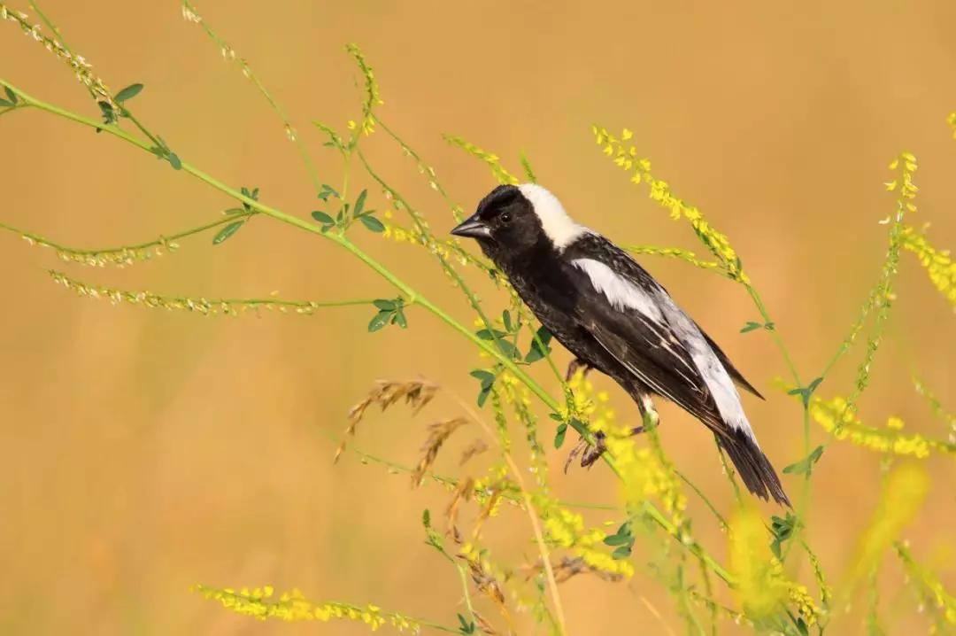 照片背后的故事:“日落時的鄧恩牧場草原變成了一片金黃色的草地,這只雄性食米鳥短暫的落在樹枝上好奇地掃了眼我的相機。他機械般的鳴唱被幾十只在我頭頂飛過的同伴回應著,我趕緊在它飛走前拍下了這張照片。”